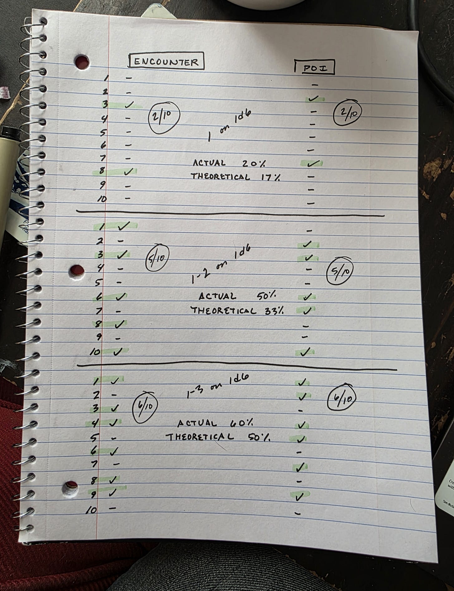 Just for a simple trial, I thought I’d roll up a single-encounter, single-POI for each day, with 1 in 6, 2 in 6, and 3 in 6 chances to see what I got. Results were a bit on the high side, but that’s just how randomness works.